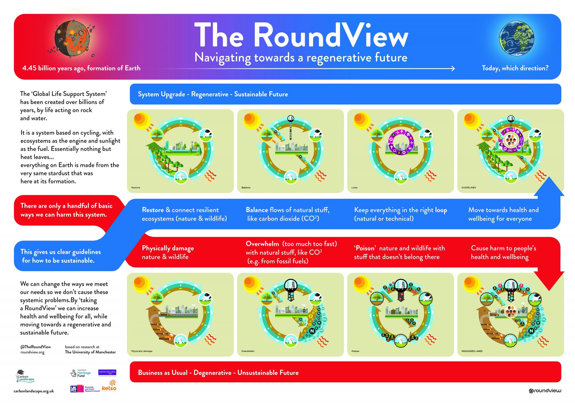 The RoundView is a big-picture, positive framework for sustainability learning and communication. It provides a clear set of guidelines and vocabulary based on the opposites of the root causes of environmental damage. It breaks down barriers to action by showing that transformative change is not only possible, but can be achieved through our cumulative actions.